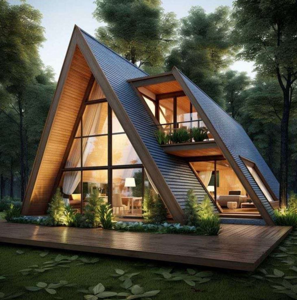 1.Triangular Shape:A-Frame houses are characterised by a triangular shape with steeply pitched roofs.