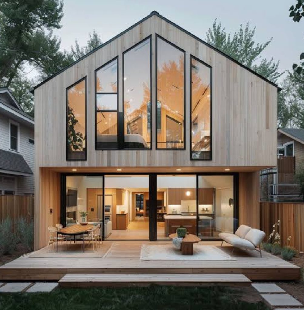 A-Frame houses are characterised by a triangular shape with steeply pitche droofs and angled walls that meet at the top to form a sharp peak. This simple and rustic design is often a symmetrical, with a unique facade that sets it apart from other architectural styles. - Materials