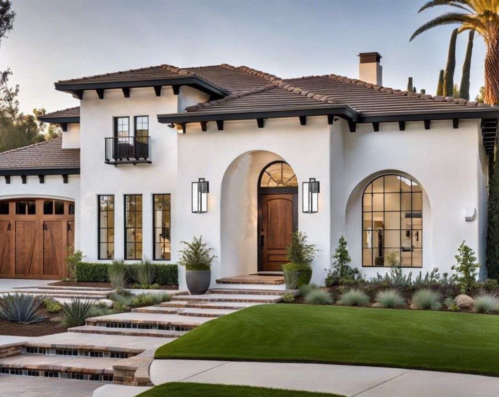 Spanish Mediterranean houses feature curved lines, arches, and rounded doorways, with a focus on symmetry and balance. The exterior is often adorned with ornate ironwork, decorative tile work, and carved wooden doors. - Materials
